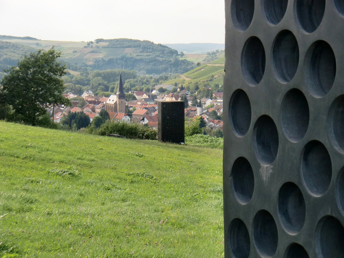 Hinten rechts: Lochluft 1970. Roter Pfälzer Sandstein, 250 x 250 x 60 cm. Hinten Mitte: Erdader 1970. Roter Pfälzer Sandstein, 350 x 150 x 103 cm.